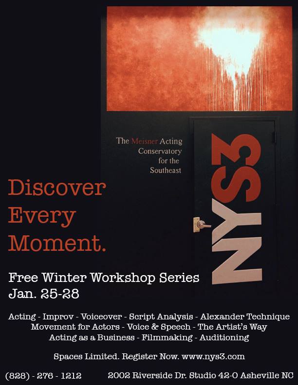 From January 25-28, the New York Studio for Stage and Screen (NYS3) in Asheville is offering a free Winter Workshop Series in preparation for their Spring 2016 semester. The series comprises eleven free professional acting workshops focusing on acting, improv, voiceover and more. NYS3 is the Meisner Acting Conservatory for the Southeast. The