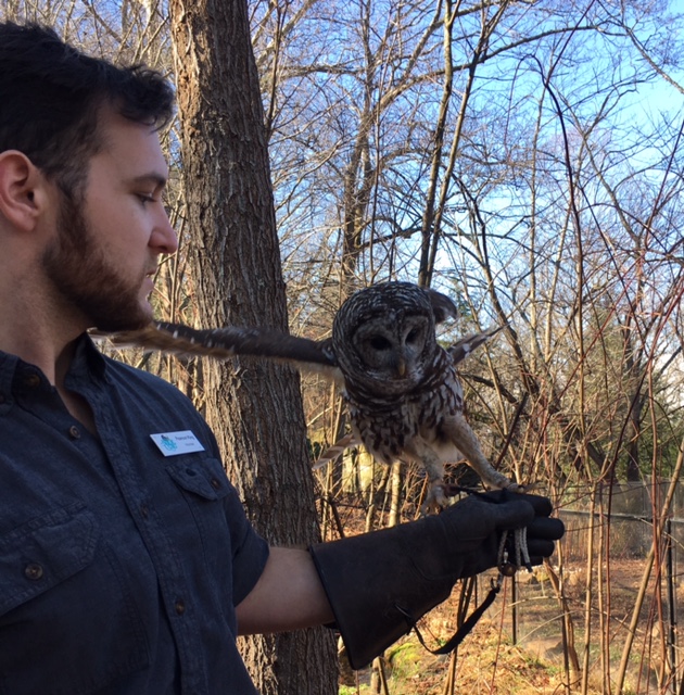Pearson King, who you may remember from a previous #ForestFriday, is a volunteer at the WNC Nature Center and offered to facilitate the meeting. I was apprehensive about how the day was going to go because I had tried to get an audience with Art before, but during my last visit, he lost his balance and thus, his mood for visitors. You see, Art the Barred Owl was hit by a car and lost quite a bit of his left wing, which left him unable to fly. As a result, he’s been at the WNC Nature Center for the last 17 years. Unfortunately, Art’s story is a relatively common one.