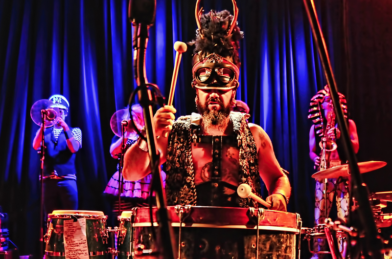 All photos courtesy of Andrew Wyatt I first encountered MarchFourth! at the Fall 2014 incarnation of the LEAF Festival. Intrigued by the program’s description of a marching band and circus act hybrid, I made my way to the stage at which they performed, and proceeded to be totally dazzled by this group of highly energetic, incredibly skilled musicians and acrobats who seemed to be having a hell of a lot of fun on stage. By the time their set was over, I was ready to join their circus. MarchFourth! is back in Asheville this week on Thursday April 16, kicking off their Southern Tour at the Orange Peel (and fresh off of recording a new album in New Orleans). An enormous group (30 current members touring in rotation, 17 on stage each performance) with a relentless touring schedule (About 110 shows per year, done in 3-4 week blocks), the group has the feel of a surreal carnival both on and off-stage. Per Dan Stauffer, founding member and tour manager: “Breakdowns (like rest stops and fuel stops) are pretty hilarious events to be seen. Musicians break out horns and drum pads and practice, dancers will get out their hula hoops or do shoulder stands, some shirtless guys will be waving traffic around us for safety, me and the driver will be under the bus or on our phones. Lots of rubber necking in backwoods or heartland country roads! We have a sense of freedom and safety due to our large numbers. Our M4 freak flag is always flying, even though the bus is white and nondescript.” Beyond simply putting on a good show, Stauffer sees the band’s mission as being emissaries of positivity and joy: “I had a really yucky and unhealthy 20's. Somehow, I abolished my misery and simultaneously helped create this exuberant and joyful project in my 30's. It really is a kind of mission for me, a way to pay it forward as far and wide as I can. Our sacrifices are plenty (and so are the sacrifices of our partners and family), but sharing our little magic bus of surprises and fun and funky get down good times is sooooo worth it. Your smiles make our day!” A few more questions with Stauffer follow: A band bio I read says you originated with a Fat Tuesday celebration in Portland. Did you (or any of the other founding members) have a particular tie specifically to New Orleans and/or to marching music? "Our First show was a Mardi Gras/Chinese New Year Party (some years I guess they happen on the same day) called Chow Yun Fat Tuesday. Two of our first set of 7 covers were from the Rebirth Brass Band: "Let's go Get'um" and "Keep that Body Movin". We also had two members of the band who were raised in NOLA. I had lived in NOLA for 8 months in the winter/spring of 1998 and was definitely affected by the brass bands and culture of New Orleans. What an eye-opener for a kid from squeeky clean and conservative Orange County! I marched around with Crash Worship a few times and was religious about seeing the Rebirth at the Maple Leaf in their weekly show, I survived a Mardi Gras working and partying insane hours, and a Jazz Fest too. This place is almost too much of a good time. Almost. - Do you all have a favorite city/event/place to play? I think we keep adding to that list. One thing about this touring lifestyle, you become a connoisseur of clubs, events, festivals and towns. New Orleans is super exciting. All the horn players run around and sit in with other bands. NYC is the same, a town with great and accessible night life. We play in Colorado more often than any other state and its hard to beat playing outdoors in Telluride Valley at Brews and Blues, or The Mishawaka. I must say the LEAF Festival could give them a run on the outdoor beauty scale. We were told we should play Asheville long before we made it there. Now I can see why, beautiful and lively town with great bars and restaurants, and art and nature. The Orange Peel is a real gem too, with its big open feel. We're happy to be making new friends in Asheville for sure!!" What would you credit as the band’s influences (musically, and/or any other art/performance medium)? "Well, the list of influences would probably be unique to each player, but if you were making a musical cocktail I'd through in some NOLA Brass, Brazillian Batucada, Count Basie big band sound, with healthy jiggers of funk and pyschedelic rock. The performance side is definitely influenced by th re-emerging burlesque scene, circus elements of stilt walking etc.. and some kind of go-go flash mob radicalism." Did your shows always have such a strong visual component, or did that evolve over time? "We have always had a visual component. Marching costumes, stiltwalkers and dance pieces have been around since day one. I think that costumes really help performers (and audience members--hint hint people) shred their mundane preoccupations and reservations. Remember this is Mardi Gras all year! " The band is, well, huge (30ish active members, 100ish alumni). How big was it when you started? Was having such a big group intentional, or did it just grow organically over time? "It was awesomely too big to start with! Our first show had more drummers than horn players (not such a good idea), we had 35 people for our first round the country tour that lasted 8 weeks. We were more like a food and booze seeking pirate ship than a touring band. Since then we acquired a great booking agent and tour year round, so we have pared down to a manageable set roster of 7 horns, 5 drums, 1 bass player, and 4 dancers =18 performers. We need to have subs as we tour extensively and life happens, ya know (for instance I'm getting married this summer and going to Europe!). These days we are a big band with a big sound, but no larger that your average 14 piece afrobeat band or big band. We are tighter and funkier than ever but still carry the spirit of the 100 person entourage our history has been." Do specific tours follow any sort of central theme, or is it more focused on just playing what feels right for the band? "J