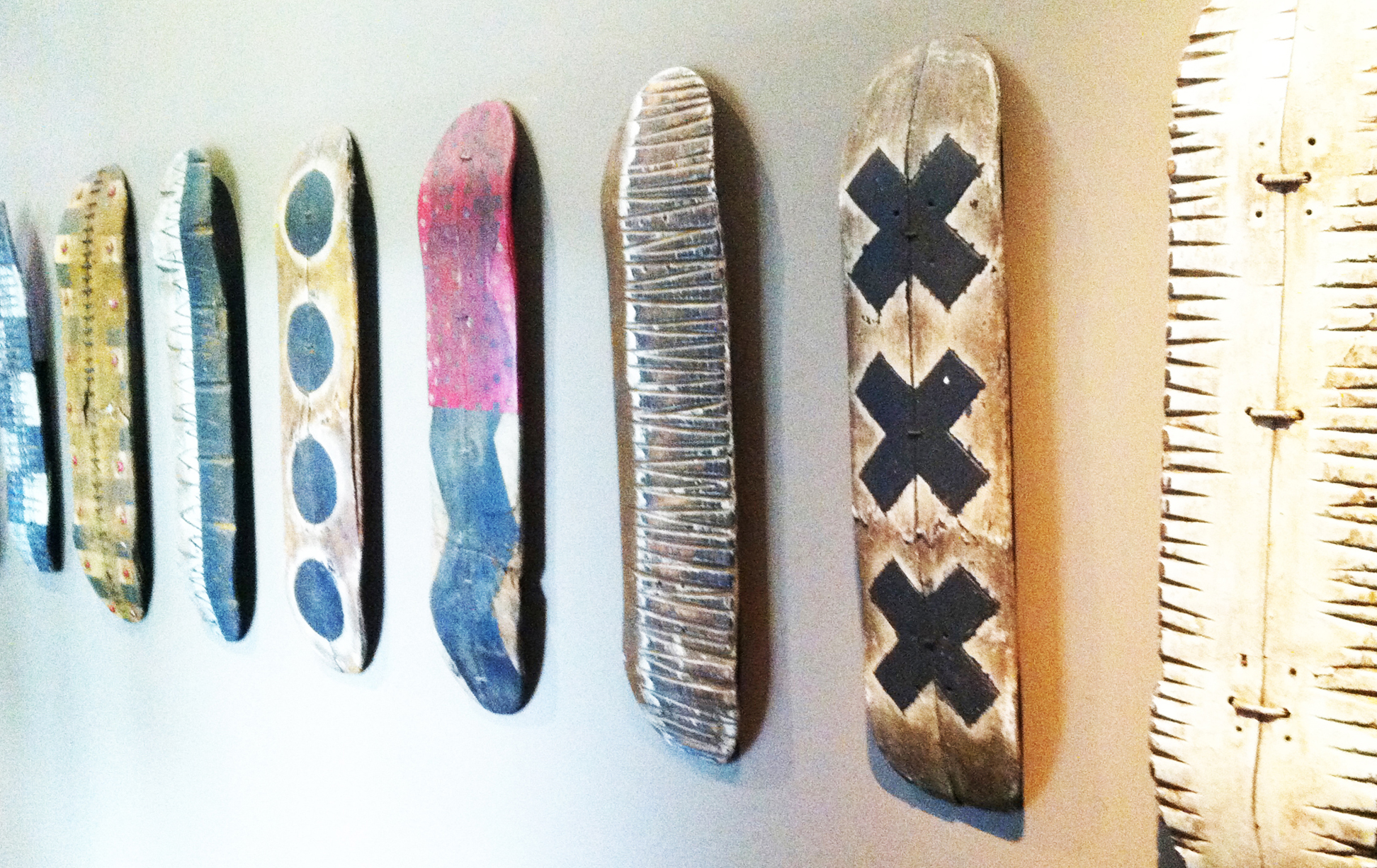 Wicked Weed and I was an immediate fan. I witnessed several skateboards mounted in a row that had been cut, burned, scarred and painted as tribal art. The iconic, pop culture shapes had been put through destruction and rebirth giving them an immediate and powerful new story that holds my attention even today.