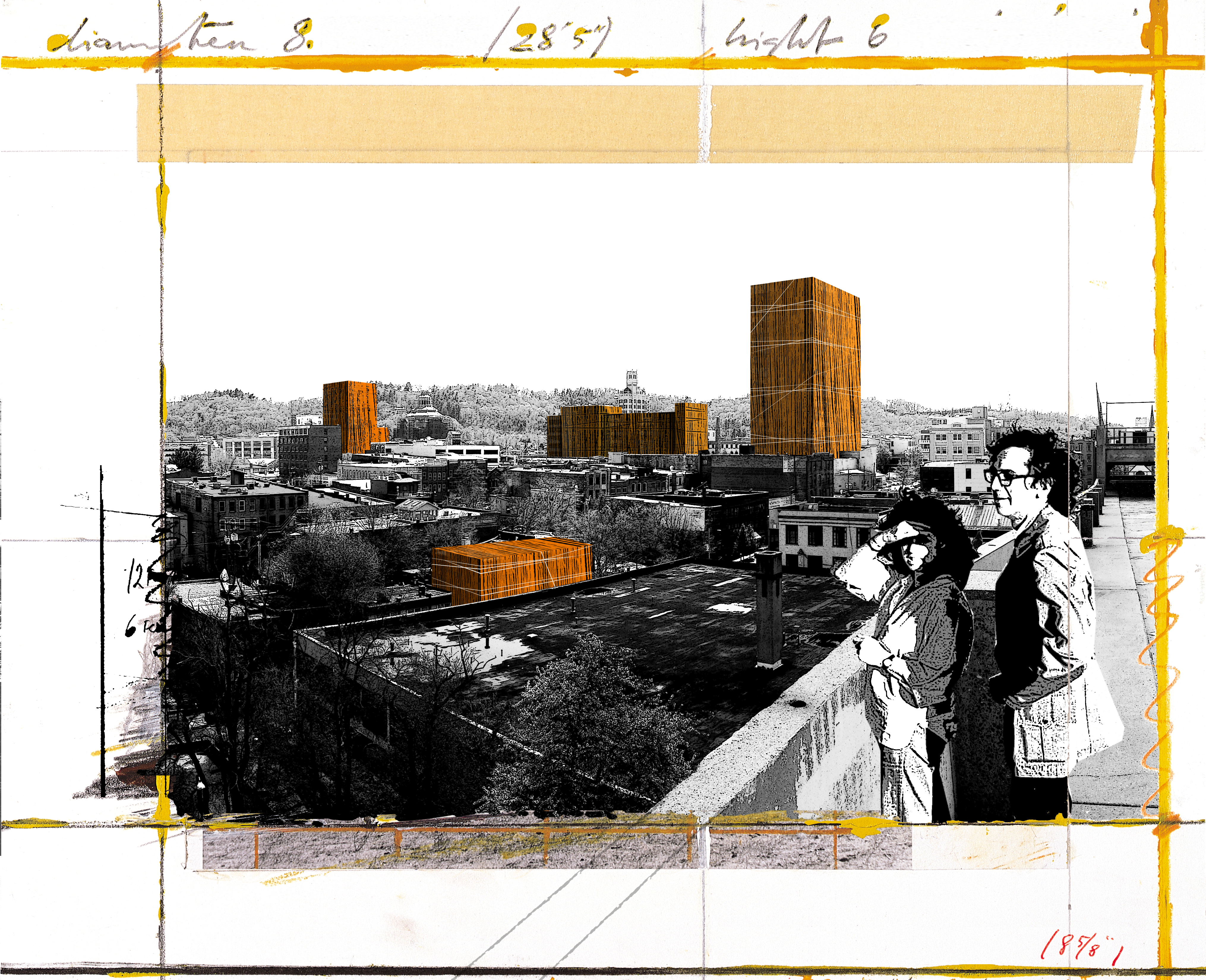 Q. What if Christo came to visit Asheville? A. We might find several buildings wrapped! “Every artist in the world likes his or her work to make people think.”-Christo Jeanne-Claude and Christo were married artists who gifted the world massive art installations for over five decades. Notably, they wrapped an island in Miami, made us look at trees with brand new splendor in 1997, and famously lined the sidewalks of Central Park with The Gates in 2005.  If you find yourself in northern Italy in the next week, you can actually Walk on Water. Although Jeanne-Claude died in 2009, they came to Asheville and lectured in 2008. I recall being completely moved by the drawings and final installation images. However, the dedication and commitment (we’re talking years and years of commitment) to each project was almost more inspiring. For any one with passion and an idea, these two are certainly excellent role models. For more information on Jeanne-Claude and Christo, click here.