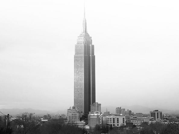 The BB&T building (in orange) could fit below the CCTV Building (center) overhang. Ever since its completion in the early 60’s, the BB&T building forever changed the Asheville skyline. Being one of the taller buildings in Asheville, it stands at 227 feet tall with a prominent location in the middle of downtown. It has become a magnet for community criticism concerning building height, architectural aesthetics, city planning and the general growth of downtown Asheville. With an eventual facelift of the building approaching, in addition to the recent hotel boom and concern over an expanding Asheville skyline, we thought it might be worth an investigation to envision what more radical changes to the downtown skyline would look like. The graphic above depicts the BB&T building (orange) measured up against some more famous structures and objects. From left to right : Space Shuttle Atlantis (Florida), Statue of Liberty (New York), Hyperion (California, the tallest living tree in the world), Pyramid of Khafre (Egypt), Seattle Space Needle (Seattle), CCTV Building (China), Titanic (Atlantic Ocean), Eiffel Tower (Paris), and the Empire State Building (New York). Being one of the tall buildings in Asheville, the BB&T building gives the impression of being more massive than it really is. In order to give its height and mass context, we replaced the BB&T building with 5 iconic structures.